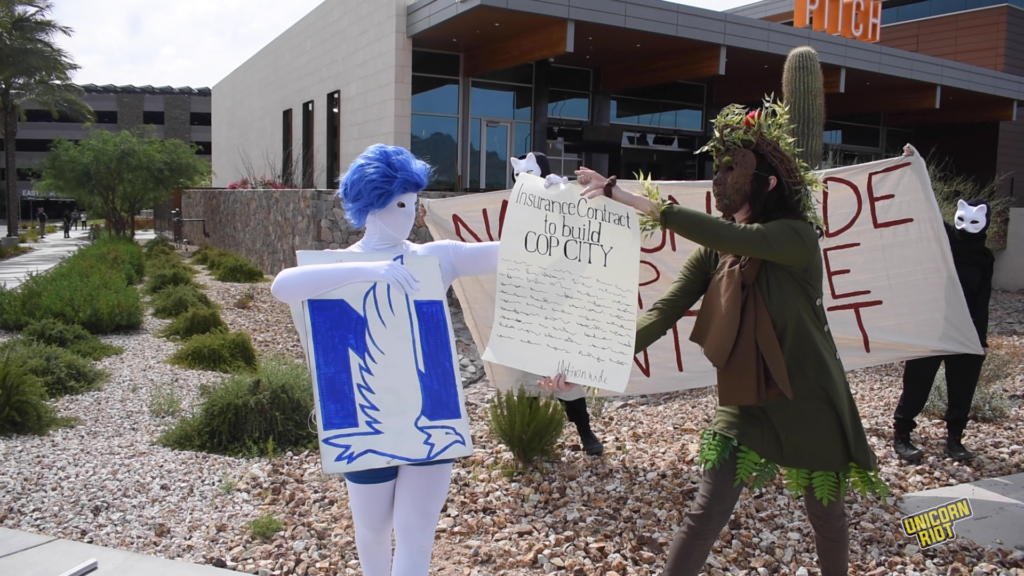 Actual representatives of Scottsdale Insurance and Nationwide Insurance did not respond to requests for comment via their media line and refused to speak with a Unicorn Riot reporter during the protest.