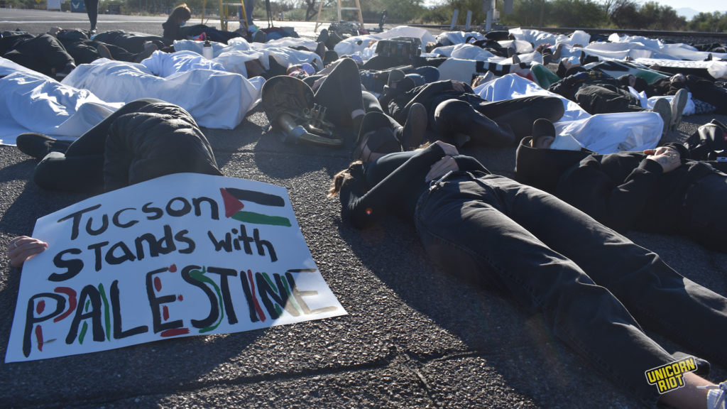 The action, which lasted about an hour and a half, was coordinated by a coalition of Tucson groups operating under the banner of the Tucson Coalition for Palestine, including Arizona Palestine Solidarity Alliance, Jewish Voice for Peace, and Derechos Humanos. The action was intended to call attention to the ongoing invasion of Gaza by Israeli military forces and the more than 9,000 lives it has already claimed.