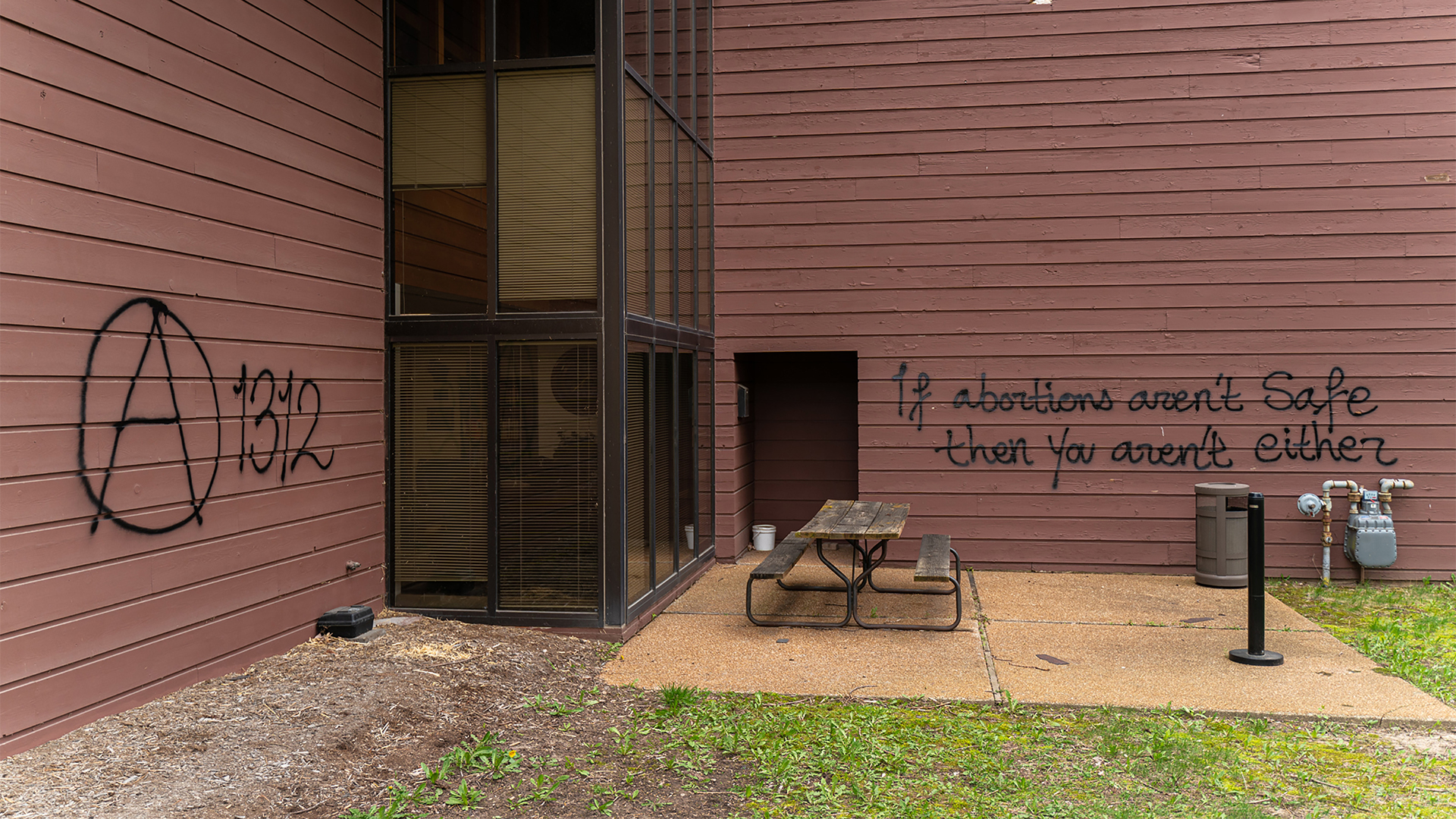 The side of the building was also covered in graffiti, reading, “If abortions aren’t safe then you aren’t either,” as well as a large circle-A and “1312” (the numeric value of the anti-cop slogan ACAB, or “All Cops are Bastards.”)